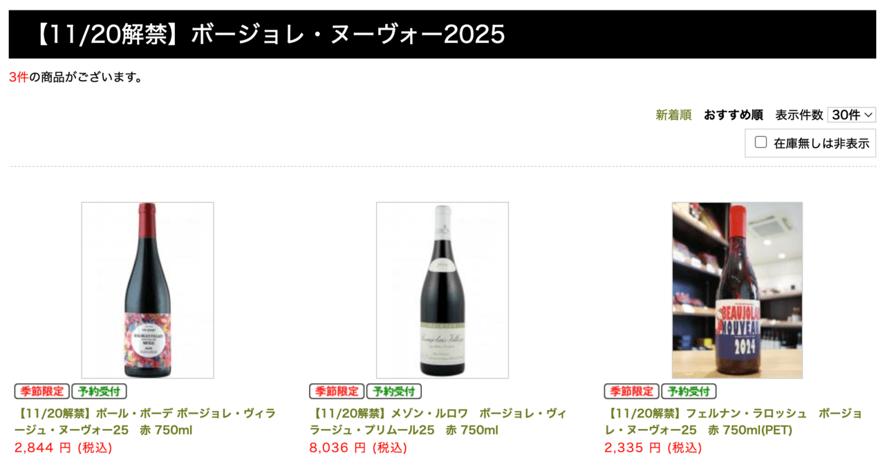 当店にはデイリーに楽しめる2000円台のものから有名メゾンのとっておきまで3種類のボージョレ・ヌーヴォーが入荷!