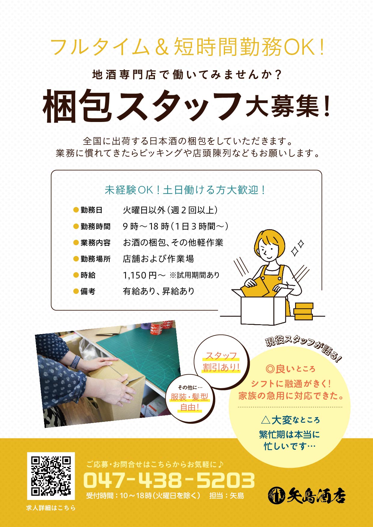 矢島酒店では業務拡大に伴い、お酒の梱包を担当してくださるパート・アルバイトの方を募集しています。
